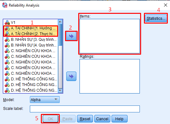 + Tiếp theo, (1) kéo các biến quan sát cần kiểm định độ tin cậy vào (3) mục Items bên phải bằng chuột hoặc (2) mũi tên ở giữa => nhấn (4) Statistics.