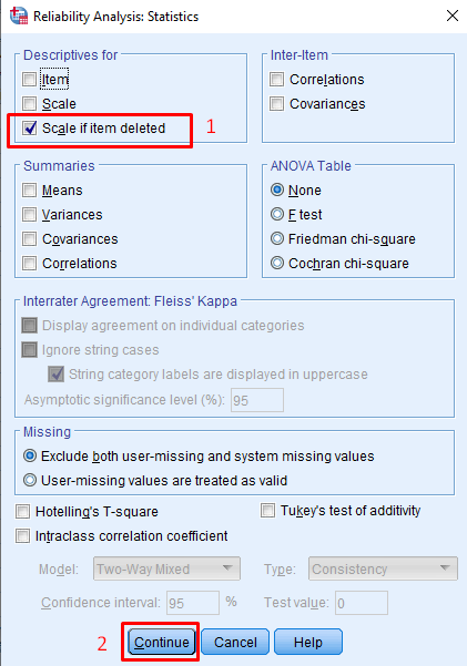 + Sau đó, trong hộp thoại tùy chọn Statistics, chọn Scale if item deleted => Continue