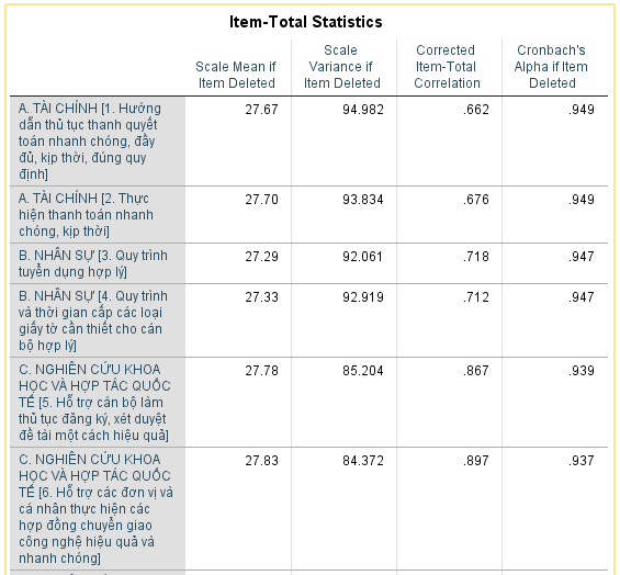 Hệ số Cronbach’s Alpha = 0.949 (lớn hơn 0.9), chứng tỏ thang đo lường rất tốt.